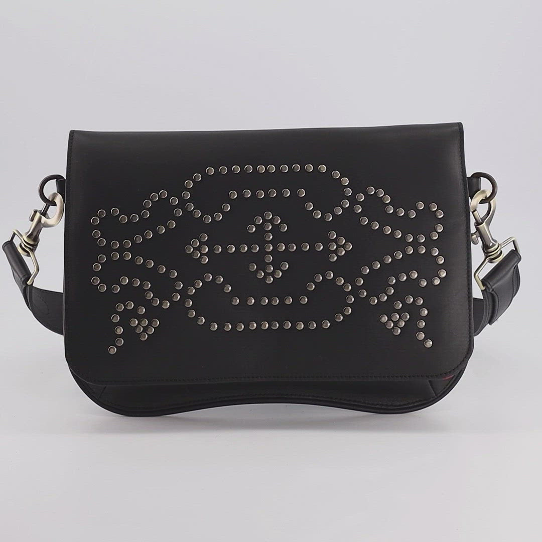 En cuir box avec sa découpe franche sur les bords, il est clouté d'un motif berbère lumineux inspiré d'un voyage à Sidi Bousaid. Il sera un partenaire parfait que ce soit au bureau ou lors de vos road trips.