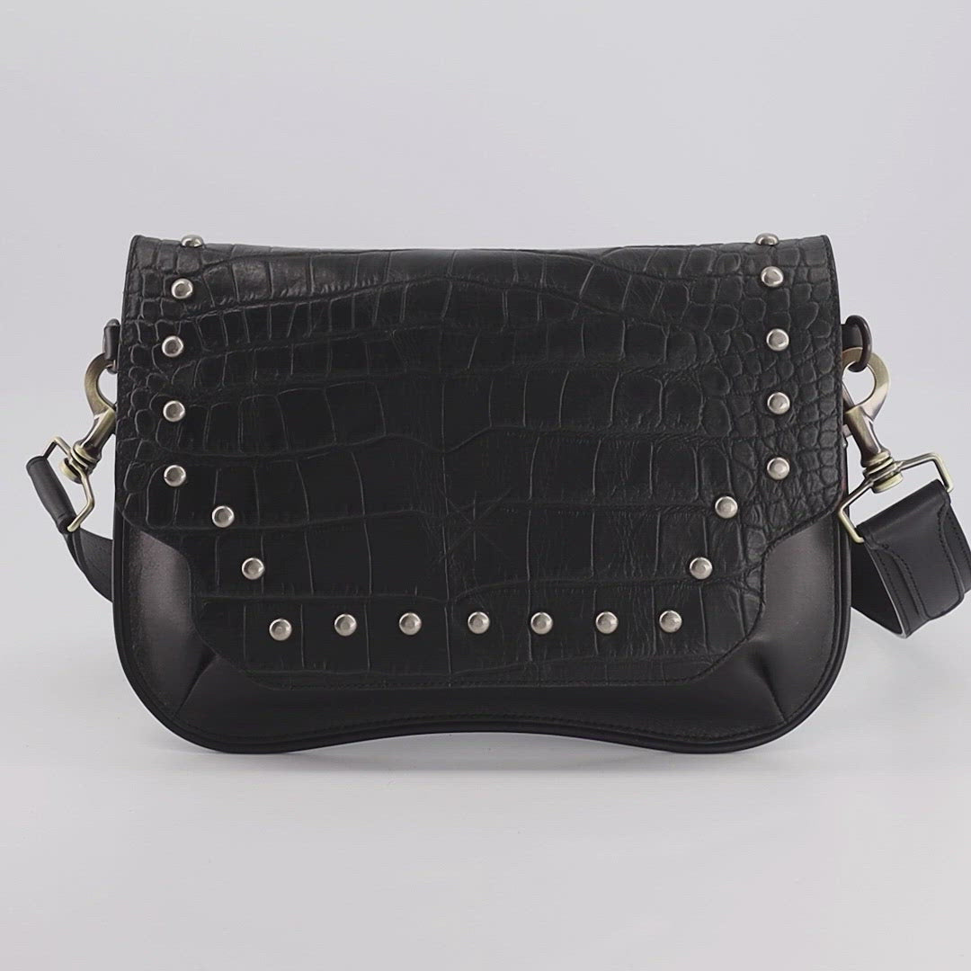 Notre sac Baby Khara en cuir noir, qui ajoute une touche d'élégance à votre tenue décontractée. Le rabat noir révèle un motif d'écailles de crocodile irrégulières, tandis que des clous métalliques argentés rehaussent son design pour un look plus affirmé. Sa base "Baby" en cuir de vachette noir, à la fois robuste et soyeuse, bénéficiant d'un tannage végétal, acquiert une patine unique avec le temps.