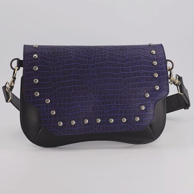 Le rabat KHARA en cuir marine impression Croco pour base Baby est la nouvelle capsule de cette saison. Un jeu de clous argentés sur son contour soulignent avec style les courbes du sac. Une allure décontractée, une pointe d'impertinence il a tout pour vous accompagner au fil des saisons.