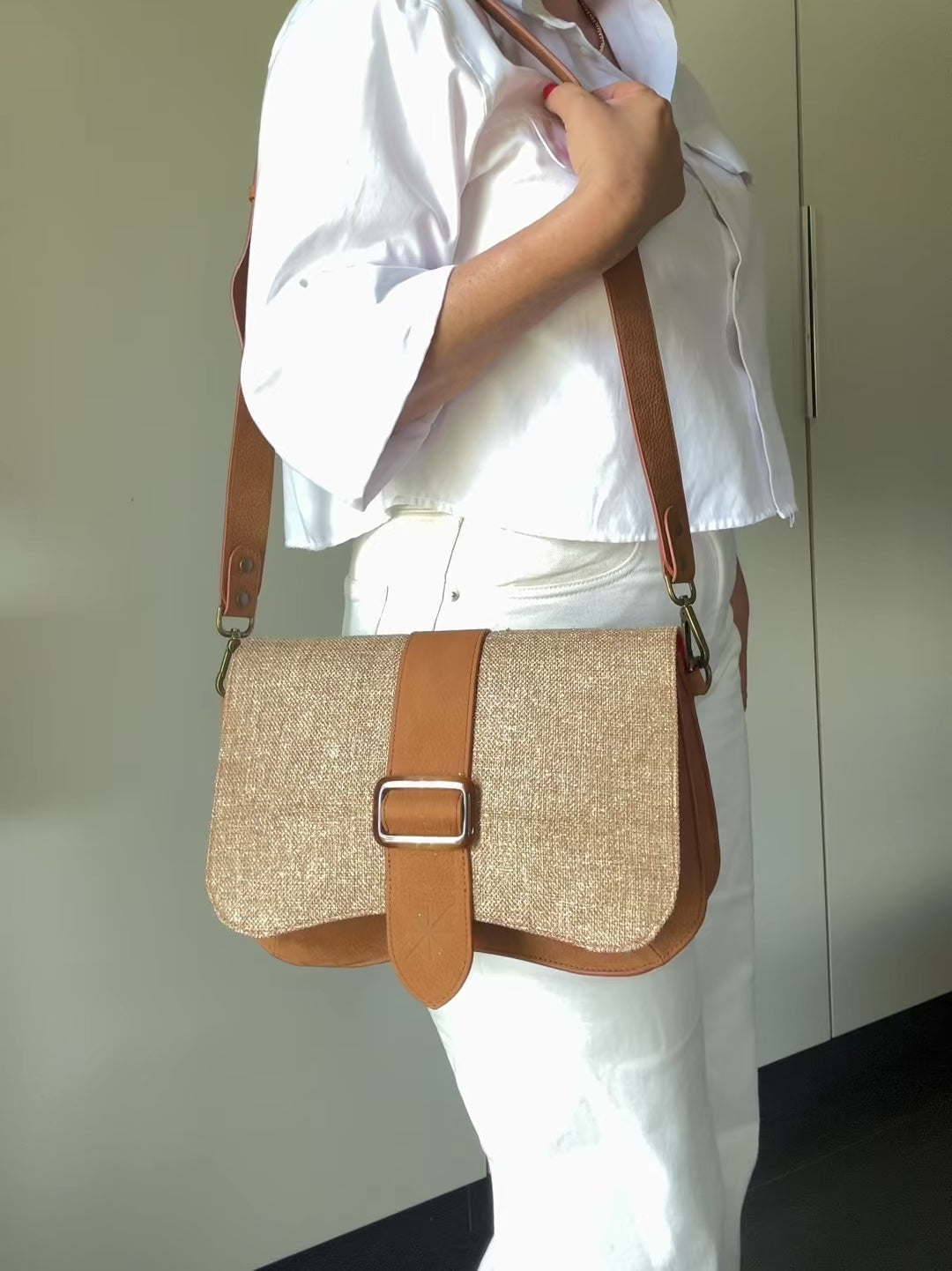 Le rabat amovible Thara en toile de lin irisée est orné d'une boucle ambré qui contraste délicatement avec la couleur du sac. Inspiré par la fraîcheur de l’été le rabat en lin s’illumine à chaque rayon de soleil.