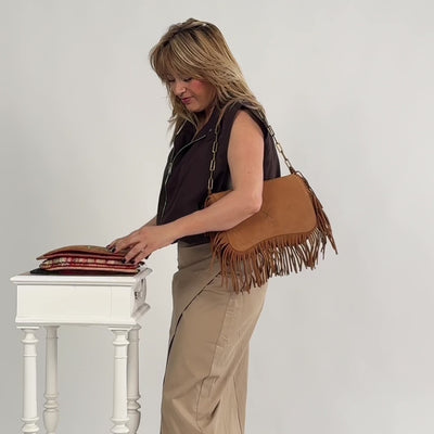 Le sac baby HEVA en nubuck camel est orné de frange, un détail au goût du jour qui se démarque. Élégant, une pointe d'audace, il saura épouser votre style et vous accompagner tout au long des saisons. Contrastez-le avec un style plus décontracté pour obtenir un style lifestyle unique . La Stella vous promet un look qui ne passera pas inaperçu.
