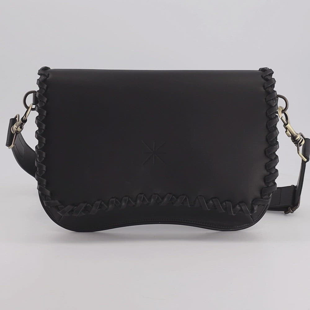 Notre sac Baby TRESSA sobre et raffiné vous accompagne durant vos journées et en toutes circonstances, c'est un incontournable de la marque. Son contour est souligné à la main de lacets en cuir assortis, Monogramme LA STELLA sur le centre du rabat.