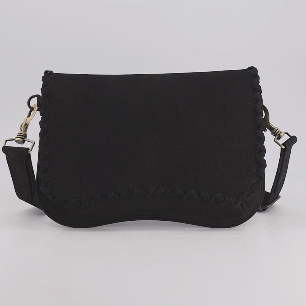 En nubuck Noir à l'aspect velours légèrement grainé, son contour est souligné à la main de lacets en cuir assorti. Monogramme LA STELLA en son centre.